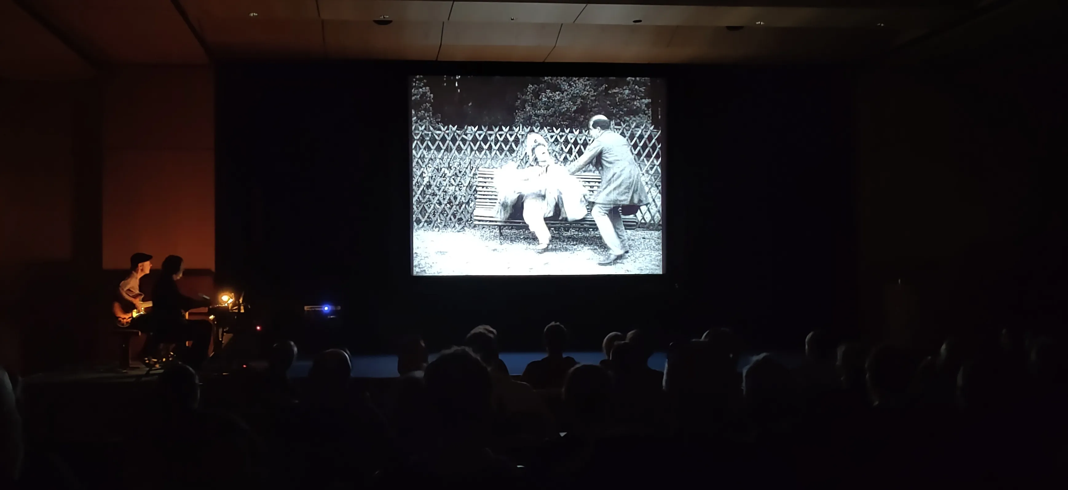 Es folgten zwei Klassiker der frühen Kinogeschichte: La Crinoline (Die Maus in der Krioline) der ersten Filmemacherin der Geschichte, Alice Guy, und Le Voyage dans la Lune (Die Reise zum Mond) von Georges Méliès, welcher sicher nicht nur durch den Film Hugo Cabret deutlich mehr Bekanntheit als seine weiblichen Zeitgenossinnen genießt. Das Live-Musiker-Duo zeigte hier zum ersten Mal seine hohe Variabilität und seinen mposanten Einfallsreichtum—die Filmmusik war ein absoluter Gewinn bei dieser Vorstellung!