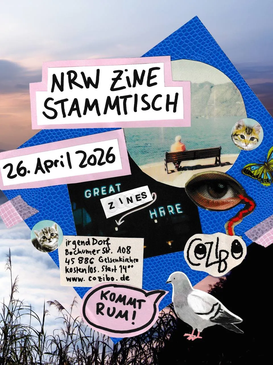 Der nächste Stammtisch ist am 9. August ab 14:00 im Inside:Out, Hochstraße 60, 42105 Wuppertal. Vielleicht komme ich dann auch endlich zu meiner ersten Schwebebahnfahrt! Noch mehr Zine-Extravaganza von Cozibo gibt es bei den kostenlosen (!) Zinepulse-Workshops im Figurentheater-Kolleg Bochum.