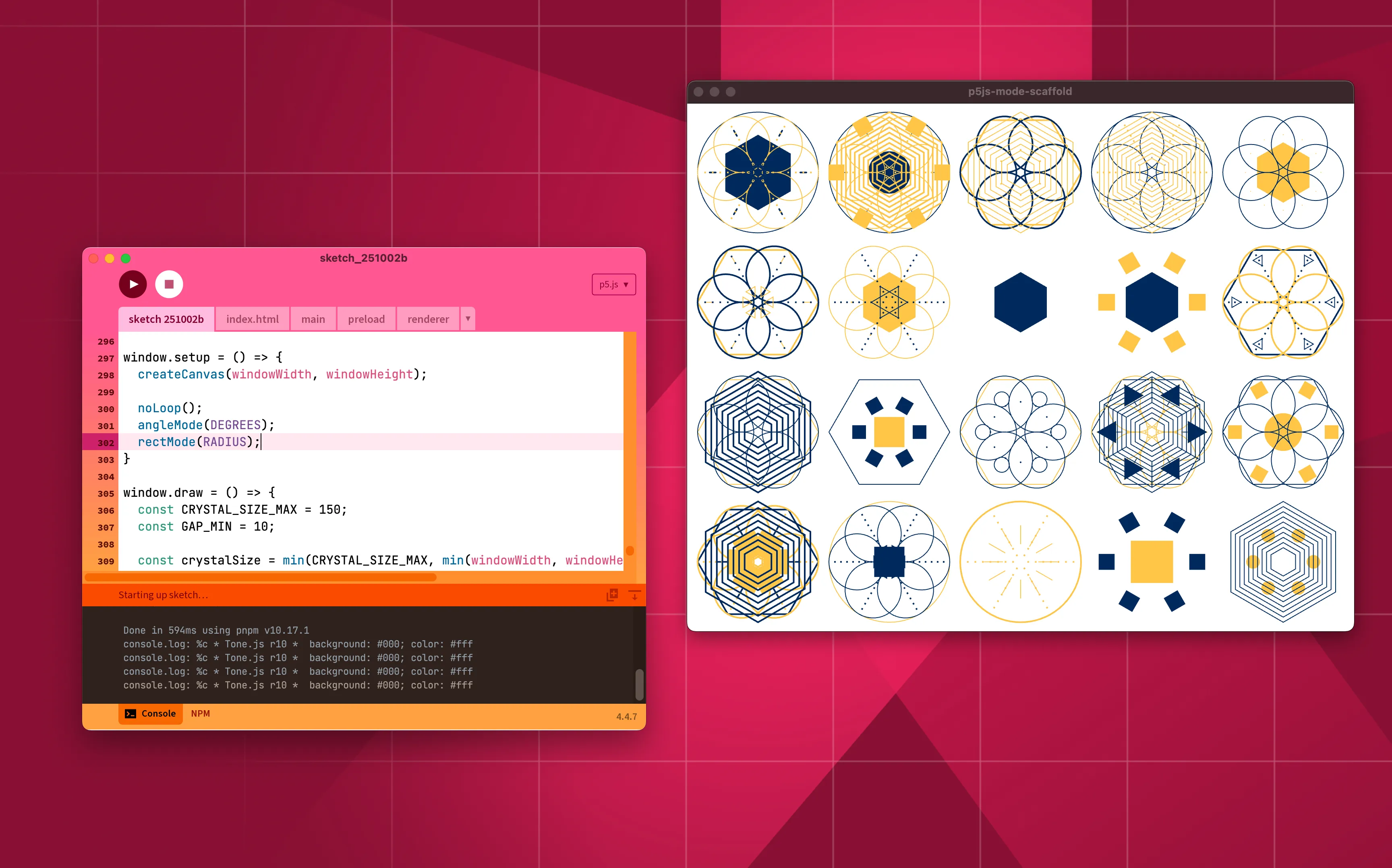 Our pr05 grantee Stephan Max just released the first version of the new p5.js Mode (beta) for the Processing Editor. It’s an early step towards an easier way to run p5.js sketches in a desktop environment. The mode uses Electron, and you can even add Node packages to your sketches!