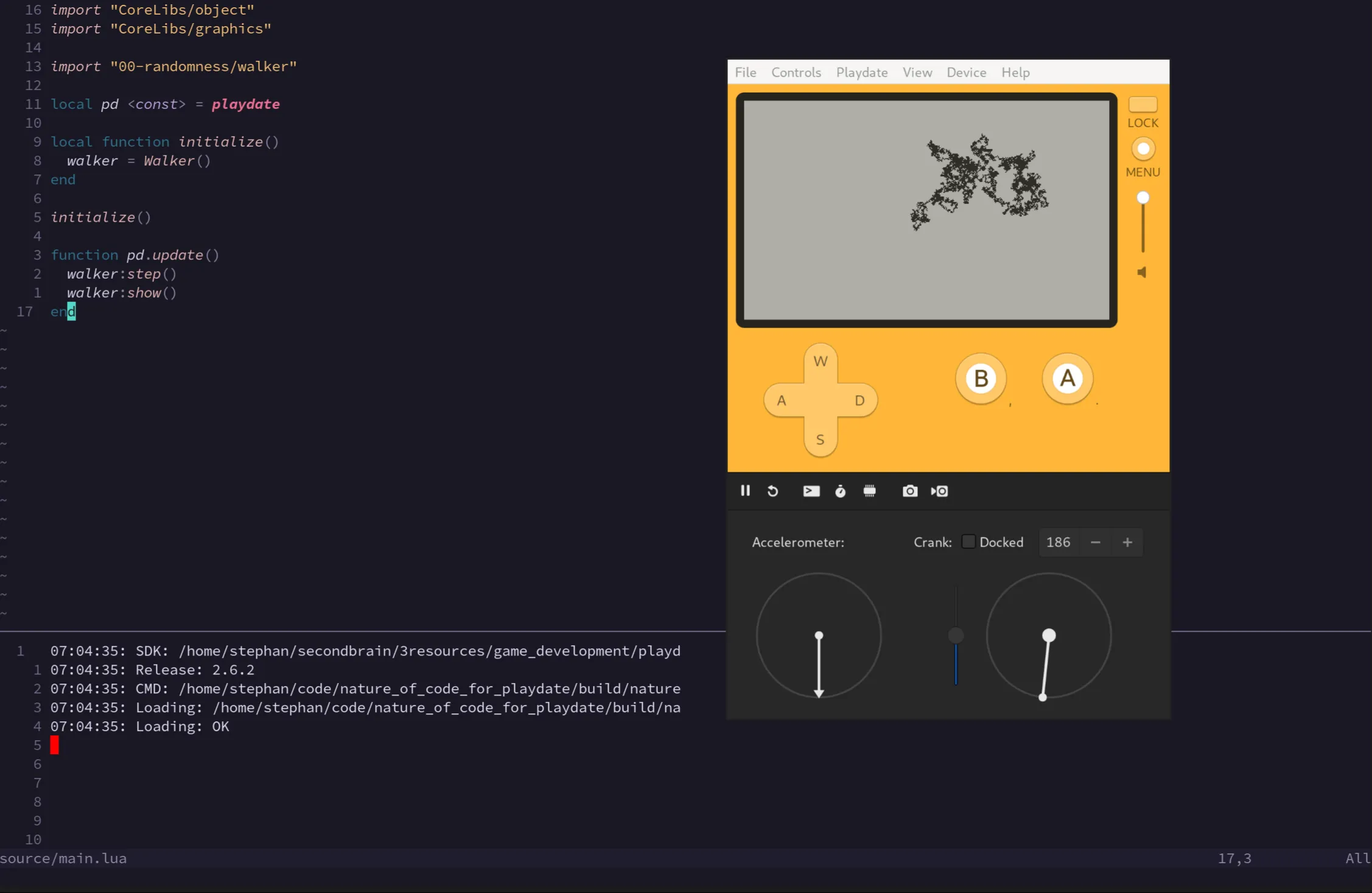 Second, I extended my makeprg command to include a call to the Playdate simulator after compiling the code. Thanks to the added support for Neovim’s terminal emulator via the dispatch-neovim plugin, I get all the console output of the simulator straight into my editor. Build and run at the press of a button!