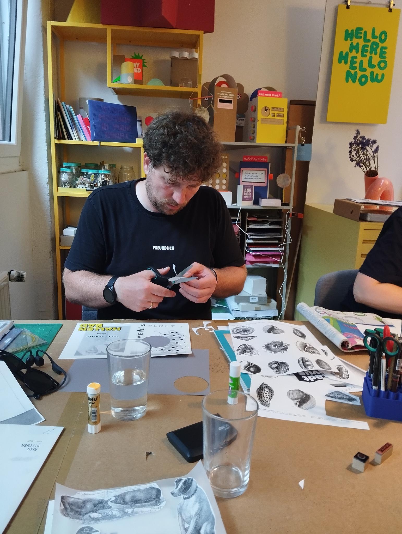 führen. Den Preis von 78 € empfinde ich als superfair, denn enthalten sind eine Mappe mit Postkarte, Papier in verschiedenen Grau-/Schwarztönen für die Druckvorlage, die zweiseitige Druckvorlage für einen zweifarbigen Druck, ein Test-Druck, sechs Final-Drucke und dazu noch Kaltgetränke und Kaffee. Das Ganze im Studio komplementaer von Micha Schmidt, das vor Farbe, Ideen und interessanten Gadgets/Künstlerbedarf nur so platzt.