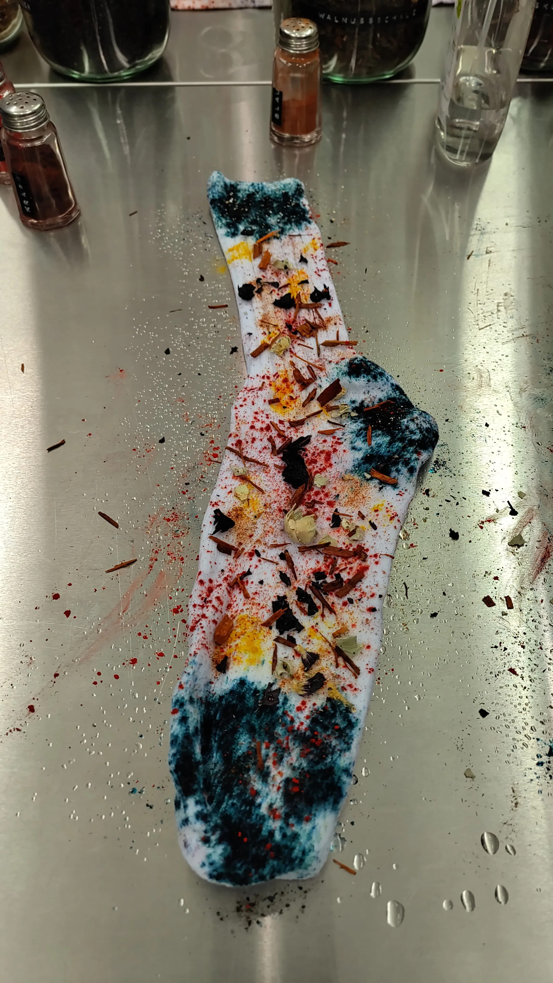 Wir bekamen eine kleine Einführung in das Verfahren, die Rohzutaten in großen Einmachgläsern, die konzentrierten Farbpigmente in Gewürzstreuern und inwieweit die Farben miteinander—aber auch mit Eisen, Soda und Essig—reagieren. Unterm Strich kann man das Resultat aber nur bedingt steuern, was ja auch den Reiz des Bundle-Dye-Verfahrens ausmacht: Färbemittel direkt auf Textil auftragen, zusammenrollen und -binden und ab in den Dampfgarer. Du kannst dir vielleicht vorstellen, dass da einiges dem Zufall überlassen werden muss. Simon nannte den Prozess chaotisch-kreativ
