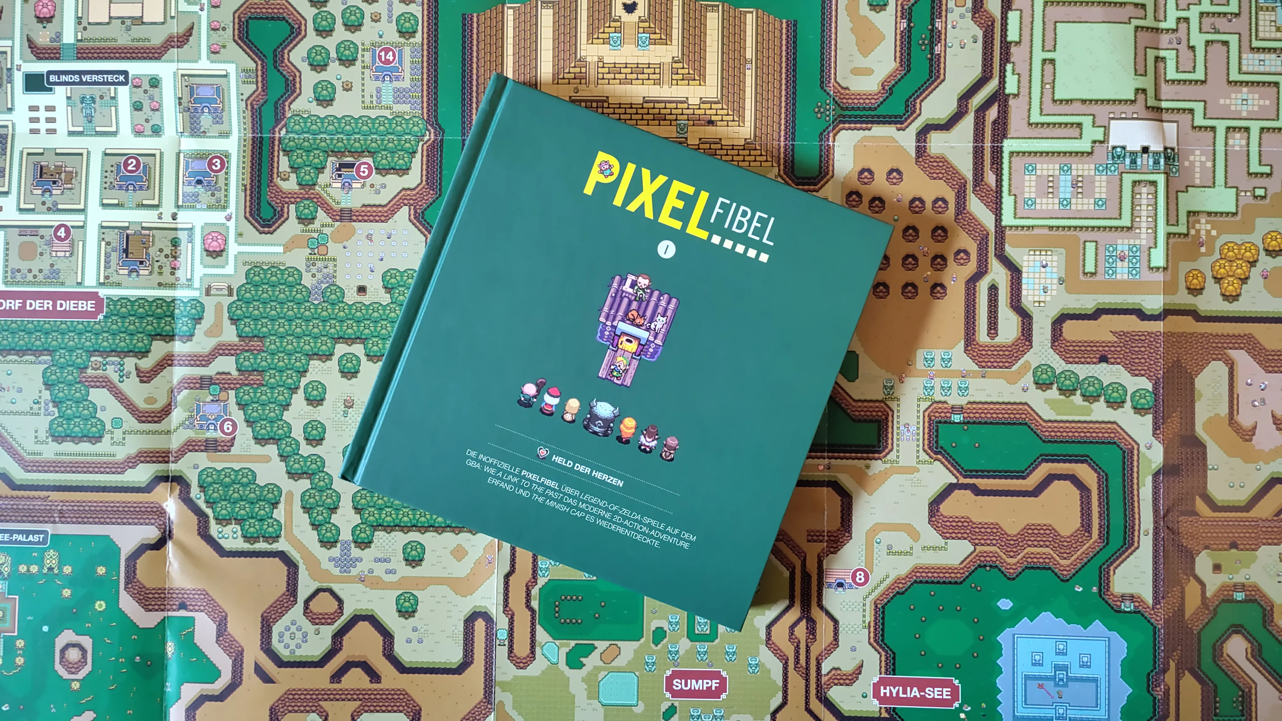 Lange hat es gedauert und das Warten hat sich gelohnt: Heute kam die Zelda-Pixelfibel von elektrospieler bei mir an—eine wunderschöne, kompakte (16,5 cm × 16,5 cm) Hardcover-Liebeserklärung an die Zelda-Spiele auf dem Game Boy Advance. Komplette Überraschung für mich: Eine doppelseitige Hyrule-Karte der Licht- und Schattenwelt von The Legend of Zelda: A Link to the Past lag als kostenloses Add-On bei!